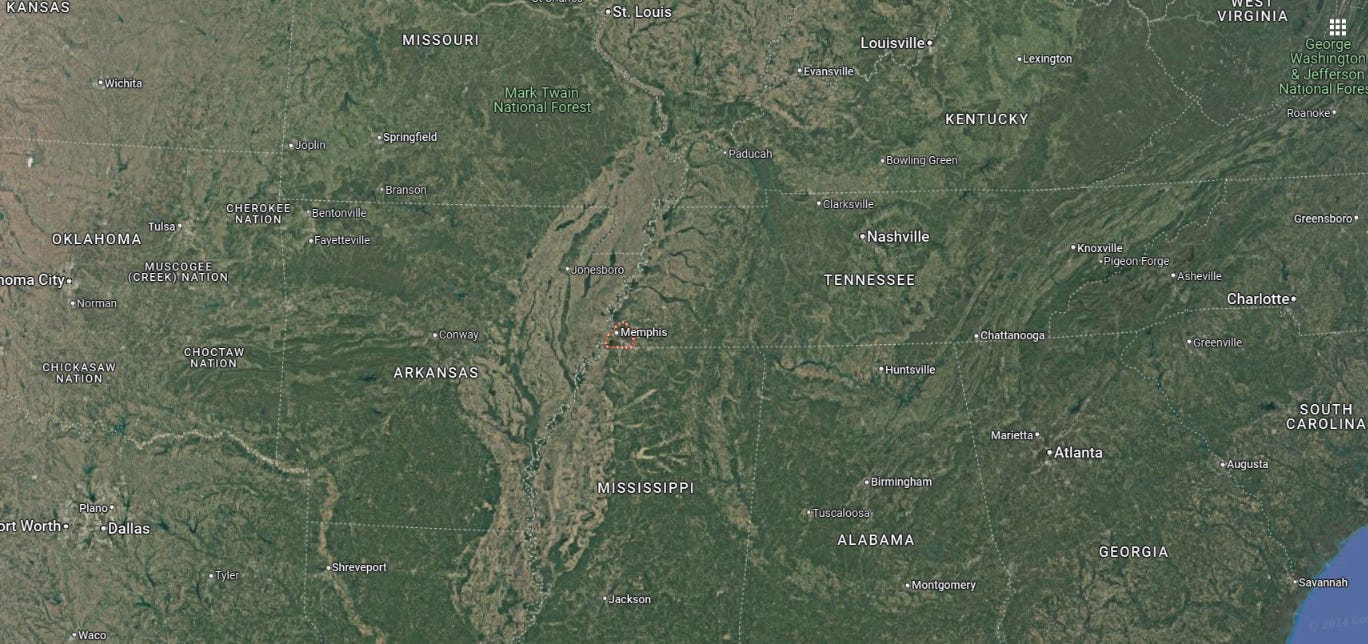 It’s unclear when or why exactly Mitchell might have taken this detour inland, given that she was travelling along the southern coast and is headed for the west coast. It would seem quite far out of the way. But it looks like she might have come up from the south coast to get to the I-40, which passes through Memphis and stretches all the way to California. Alternatively she could have taken the I-10, which goes along the southern coast directly to Los Angeles.